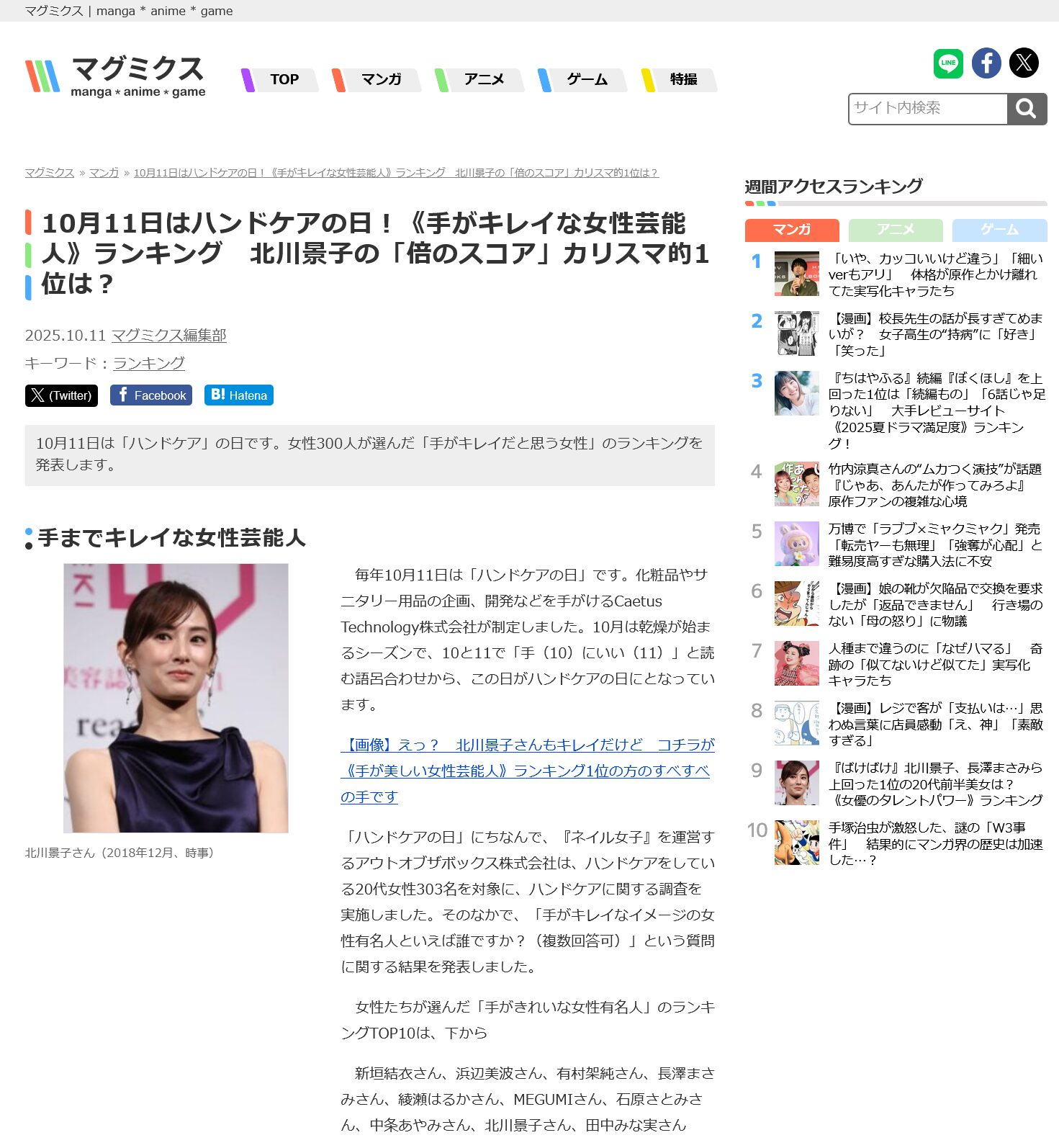 お知らせ 2025/10/11 WEBメディア「マグミクス」にて「手がキレイなイメージの有名人ランキング」の記事を取り上げていただきました WEBメディア「マグミクス」にて、 弊社メディア「ネイル女子」が行ったアンケート調査「手がキレイなイメージの有名人ランキング」を取り上げていただきました。 https://magmix.jp/post/320803 NEWS一覧にもどる