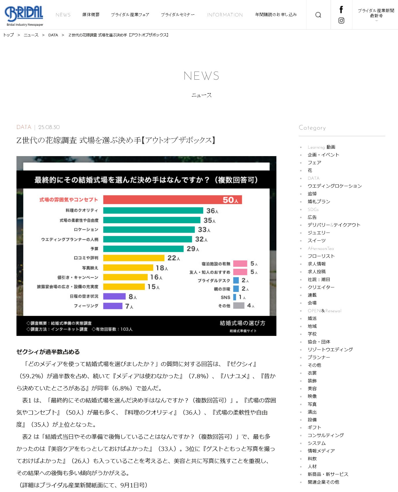 ブライダル業界のビジネス専門紙「ブライダル産業新聞」にてZ世代の花嫁調査に関する記事が掲載されました。