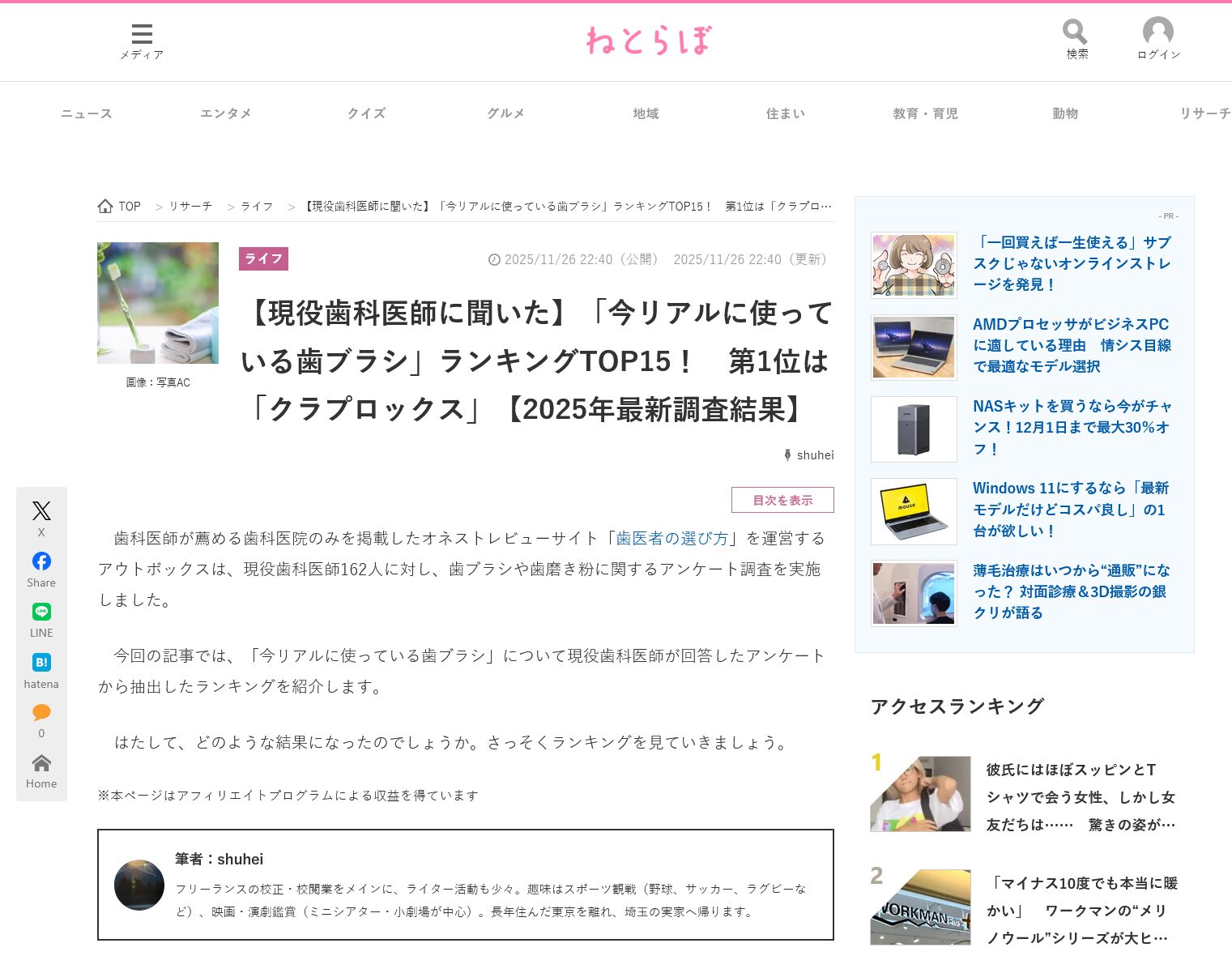 ねとらぼの記事 【現役歯科医師に聞いた】「今リアルに使っている歯ブラシ」ランキングTOP15! 第1位は「クラプロックス」【2025年最新調査結果】 に、歯医者の選び方「歯ブラシに関する調査」が掲載されました。